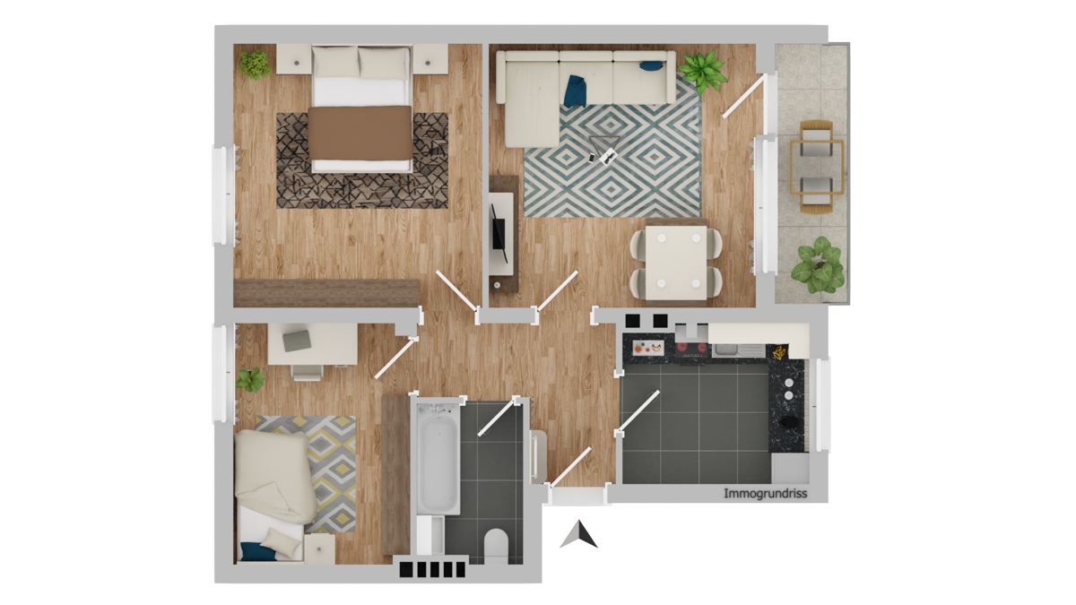 Die Wohnung beeindruckt durch ihre freundliche Atmosphäre und den durchdachten Grundriss, der die ca. 62 m² optimal ausnutzt. Sie betreten die Wohnung über einen zentralen Flur, der alle Räume geschickt miteinander verbindet. Das großzügige Wohnzimmer wird durch seine großen Fenster zum Herzstück des Zuhauses – perfekt für gemütliche Abende oder gesellige Runden mit Freunden. Zwei weitere Zimmer bieten flexible Nutzungsmöglichkeiten als Schlafzimmer, Home-Office oder Kinderzimmer.