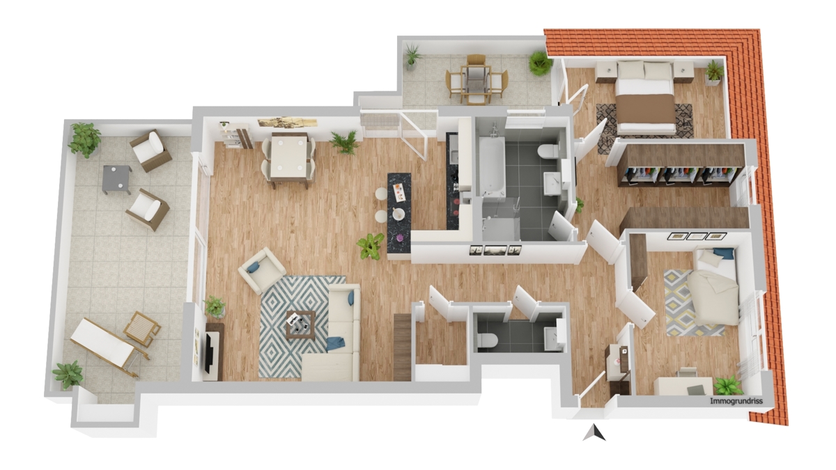Ein besonderes Highlight dieses Penthouses sind die zwei großzügigen Dachterrassen mit Südwest-Ausrichtung. Diese erweitern den Wohnraum nach außen und bieten Ihnen die Möglichkeit, das Leben unter freiem Himmel in vollen Zügen zu genießen. Hier können Sie entspannte Stunden in der Sonne verbringen, gemütliche Abende mit Freunden und Familie erleben oder einfach den atemberaubenden Ausblick über die Umgebung genießen.