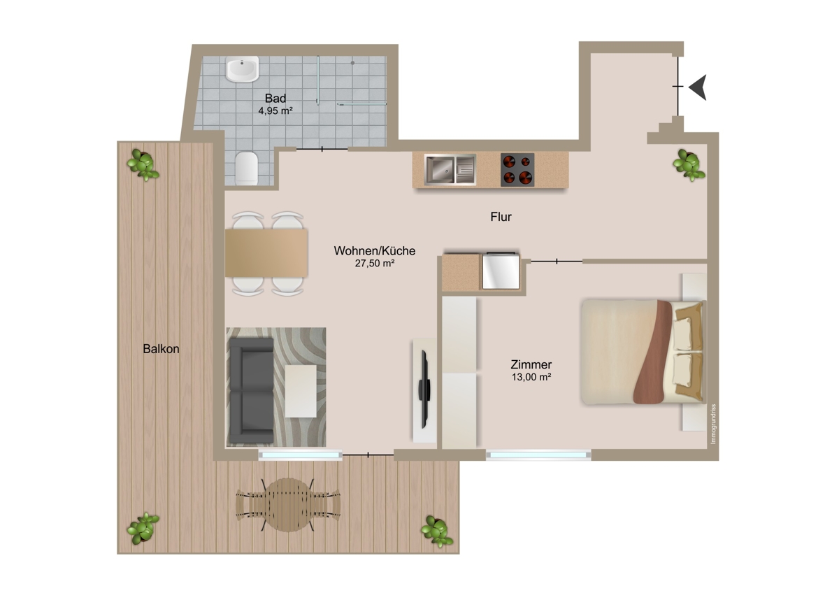Durch die moderne Wohnküche treten Sie hinaus auf Ihren Balkon, wo Sie im Sommer schöne Stunden an der frischen Luft verbringen können.