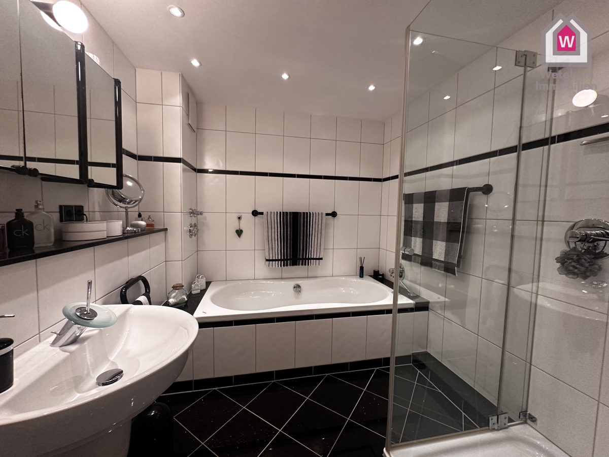 – Badezimmer mit geräumiger Dusche und Badewanne